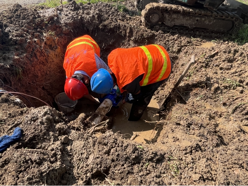 管網(wǎng)搶修組進(jìn)行現(xiàn)場(chǎng)搶修。維修人員防護(hù)齊全地進(jìn)入土坑中,維修PVC110管材使用鍍鋅包箍。維修人員嫻熟地在泄漏點(diǎn)周圍,沿管道圓周方向,徹底清潔需要安裝包箍的區(qū)域,確保安裝表面完全干燥、清潔。隨后兩位維修人員將兩個(gè)帶橡膠墊的半殼扣合在管道上,包裹住泄漏點(diǎn),確保包箍在管道上位置居中,并且沒有歪斜。用手將所有的螺栓帶上,逐步、均勻地?cái)Q緊各個(gè)螺栓。在兩位維修人員的默契配合下,整個(gè)維修過(guò)程僅用時(shí)十五分鐘,展示了維修人員過(guò)硬的維修技術(shù)。在漏點(diǎn)修復(fù)后進(jìn)行了開閥試水,無(wú)問(wèn)題后機(jī)械挖掘組在現(xiàn)場(chǎng)路面恢復(fù)。