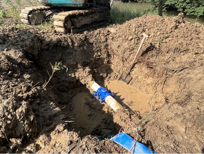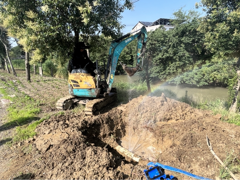 演練現(xiàn)場(chǎng),此次搶修管道為DN110PVC管道,首先由維修人員關(guān)閉搶修點(diǎn)上下游閥門,在專人現(xiàn)場(chǎng)指揮下,機(jī)械挖掘組進(jìn)行漏點(diǎn)挖掘。挖掘機(jī)設(shè)備運(yùn)行良好,很快就將漏點(diǎn)挖出。漏點(diǎn)挖出后,使用水泵將坑中余水抽干。